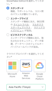 ここでは、Edition を「スタンダード」、クラウドプロバイダーを「AWS(東京リージョン)」とします。(過去データの復元が可能なタイムトラベル機能等を検証する場合は、Editionを「エンタープライズ」にしましょう。)