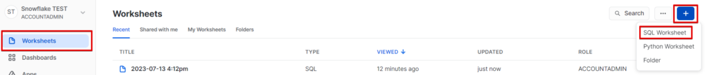 左ペインの「Worksheets」を選択してあることを確認し、右側の+ボタンをクリック、「SQL Worksheet」を選択します。